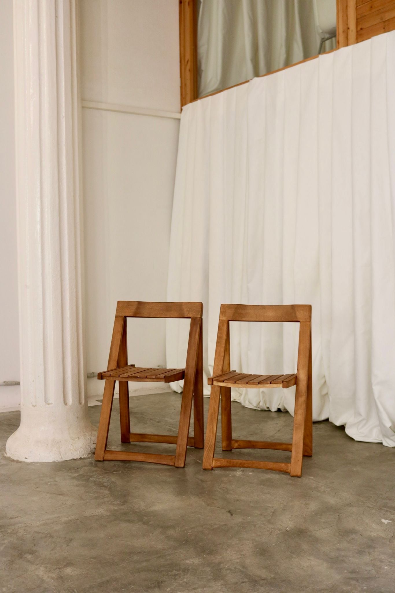 Aquestes 2 cadires plegables han estat “actualitzades” perque lluixin l’estetica actual (fusta natural sense vernissos ni colors taronjosos) pero mantenen l’esencia de la cadira plegable de verbena de tota la vida.
