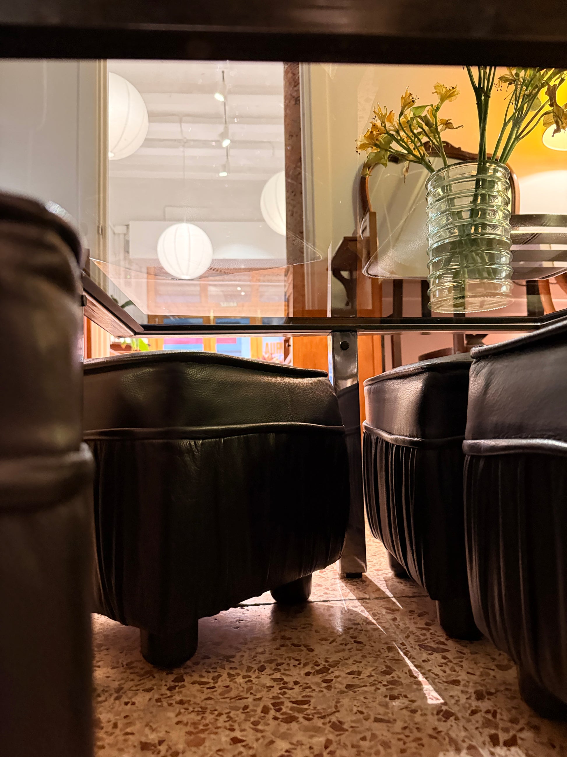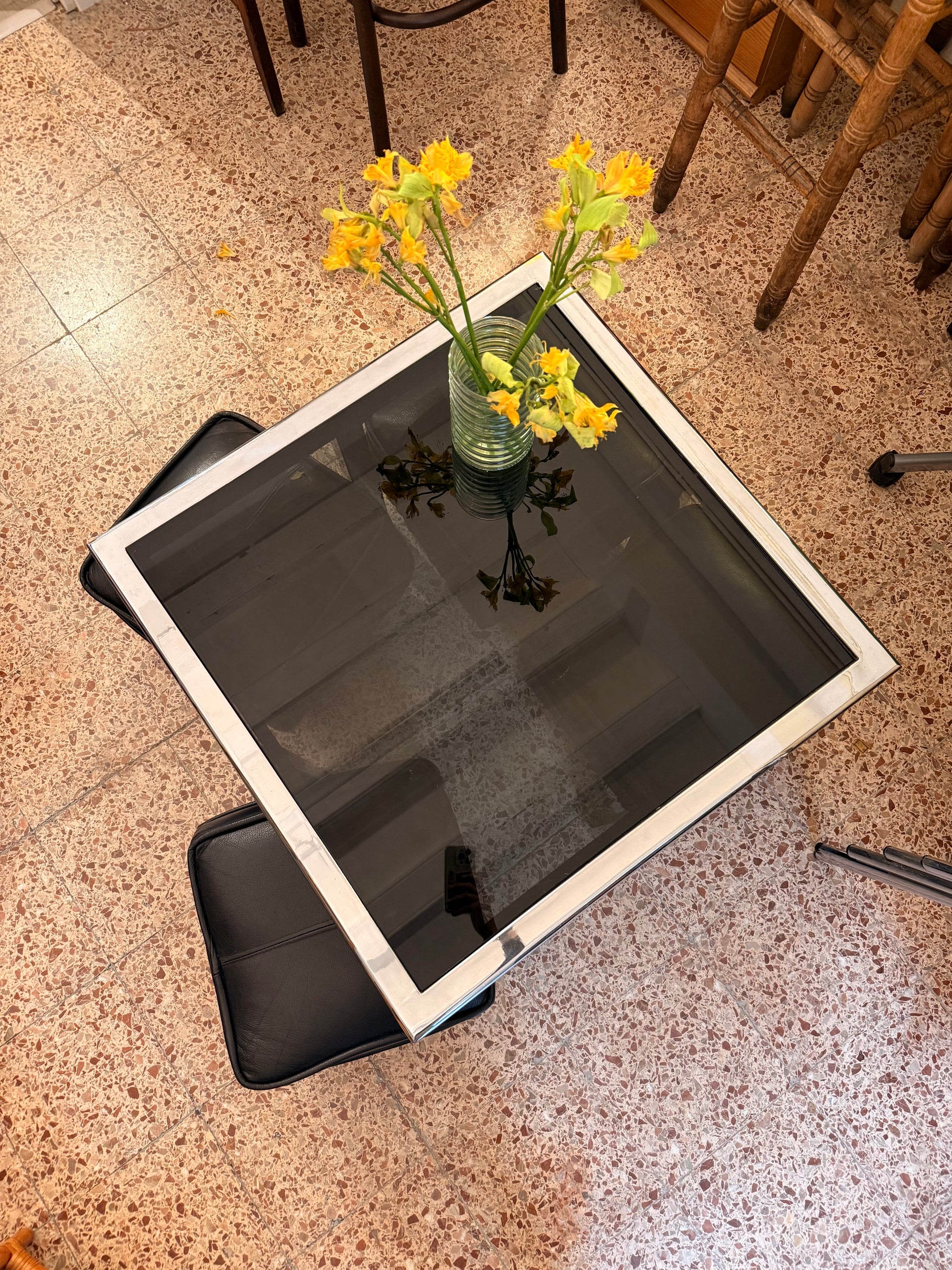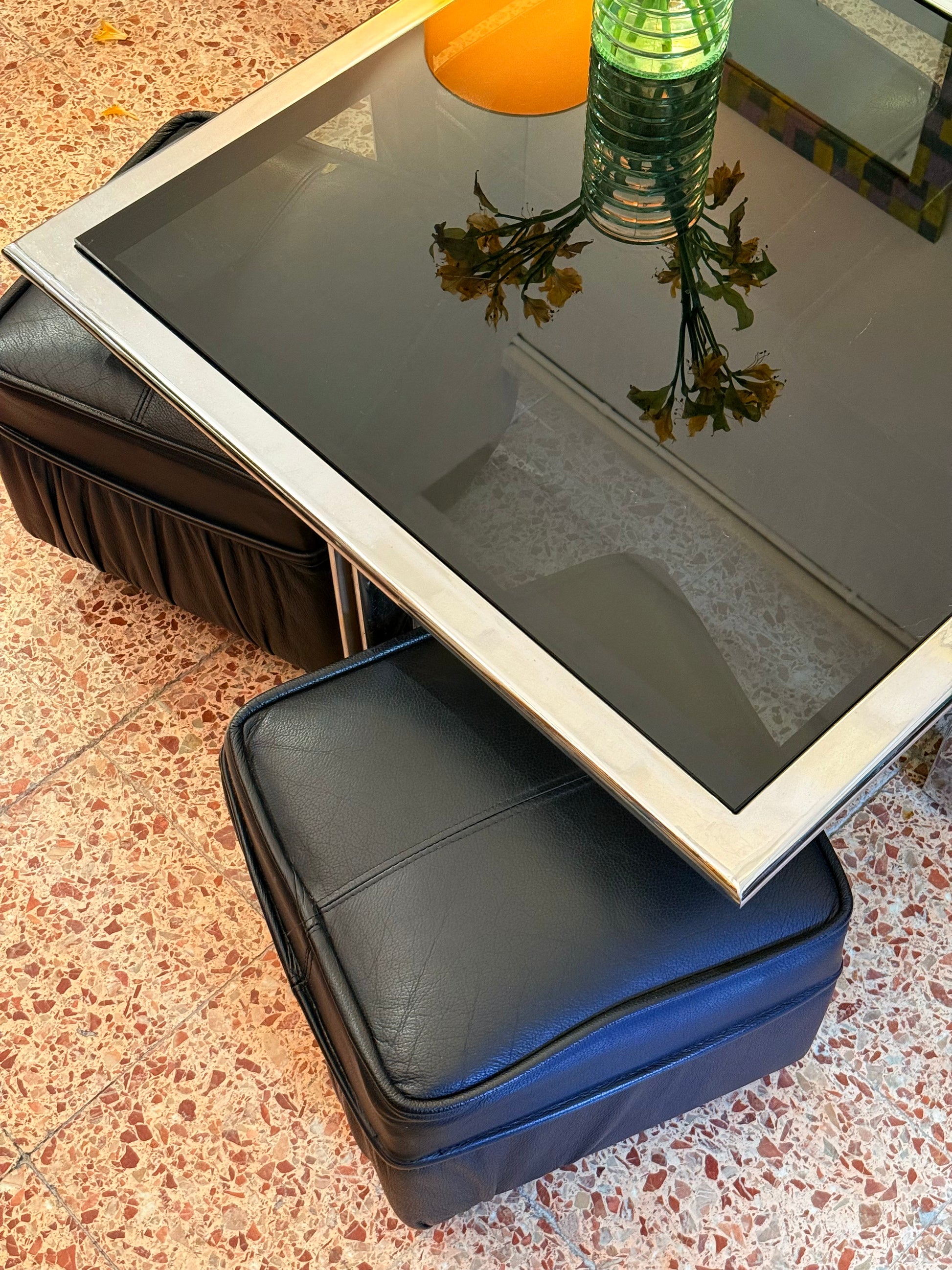 Taula de centre quadrada d’inox amb vidre fosc qua va en conjunt amb 4 puffs de pell negre