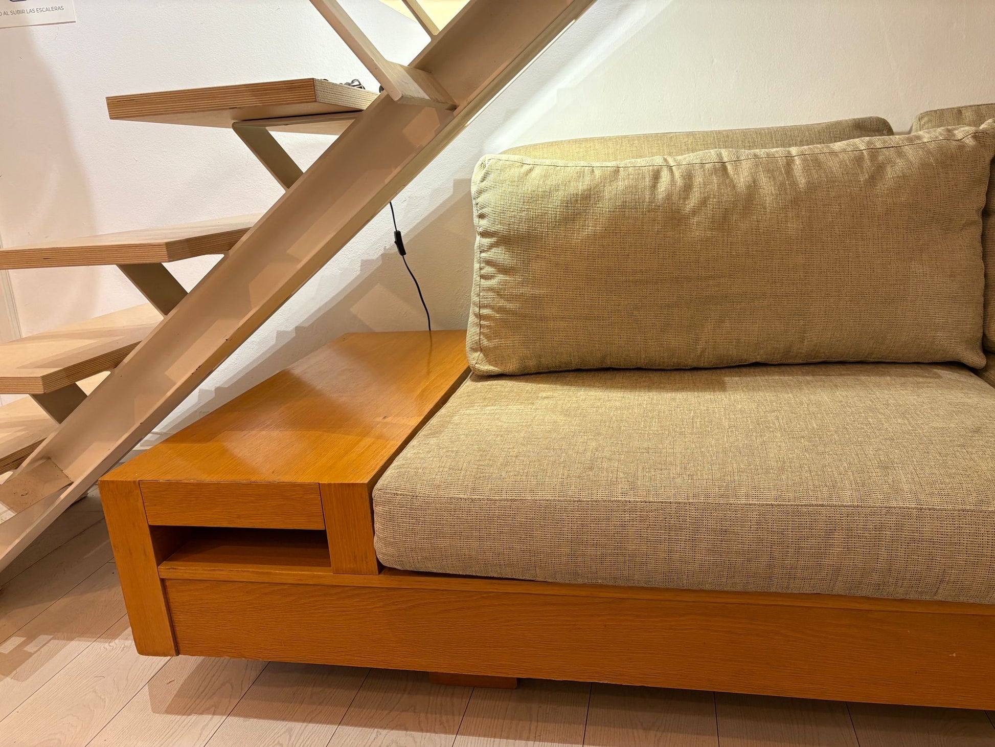 Sofa molt comode de fusta i tela. Els coixins van directament recolzats a la paret i la seva funda es pot extreure per rentar. A l’estructura de fusta te un calaixet i un espai per deixar-hi objectes.