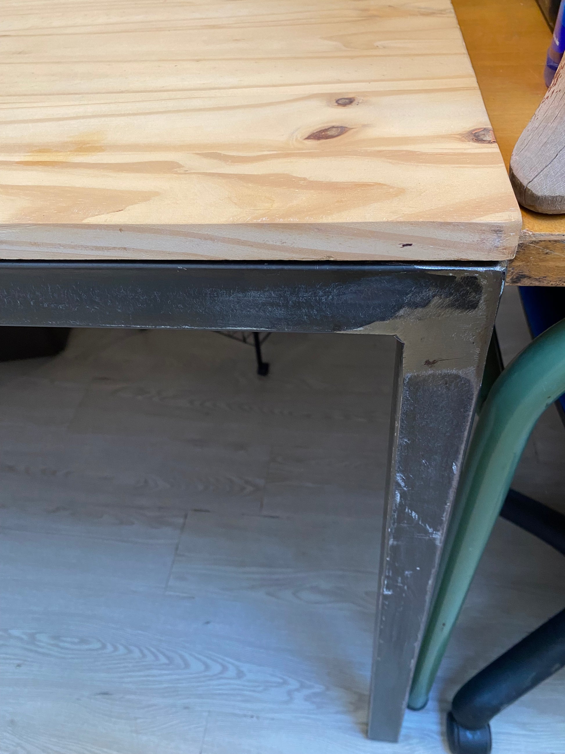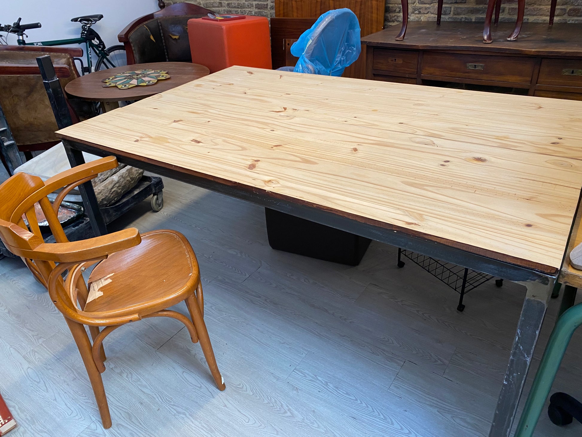Taula rectangular amb potes metal·liques i sobre de fusta de pi natural. Per 6 persones, fins a 8.