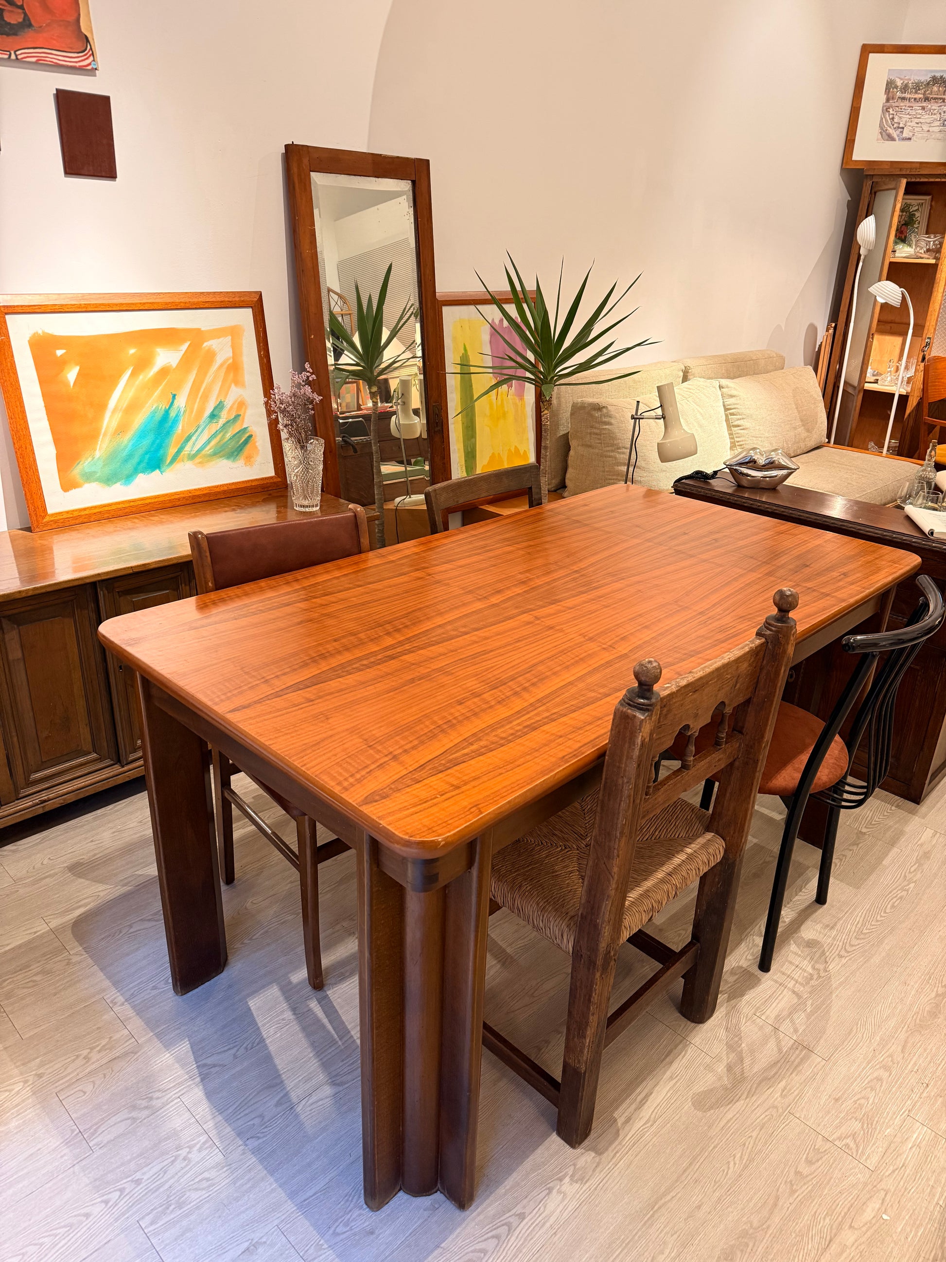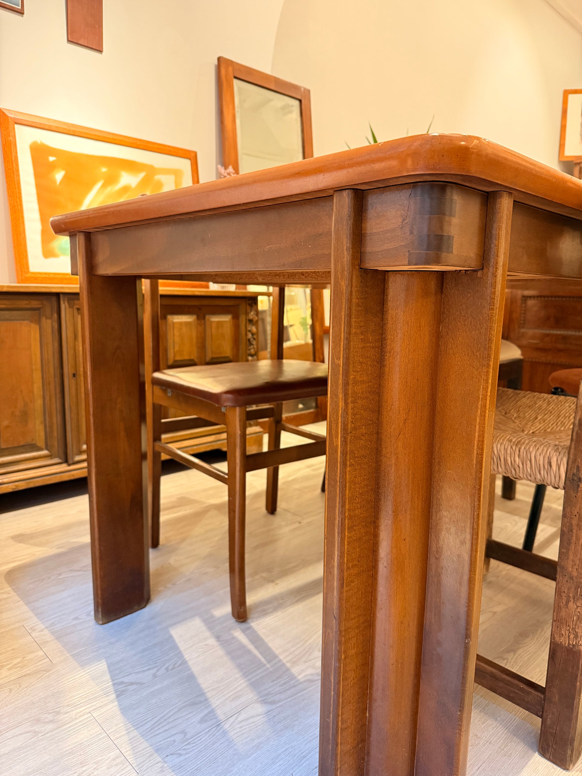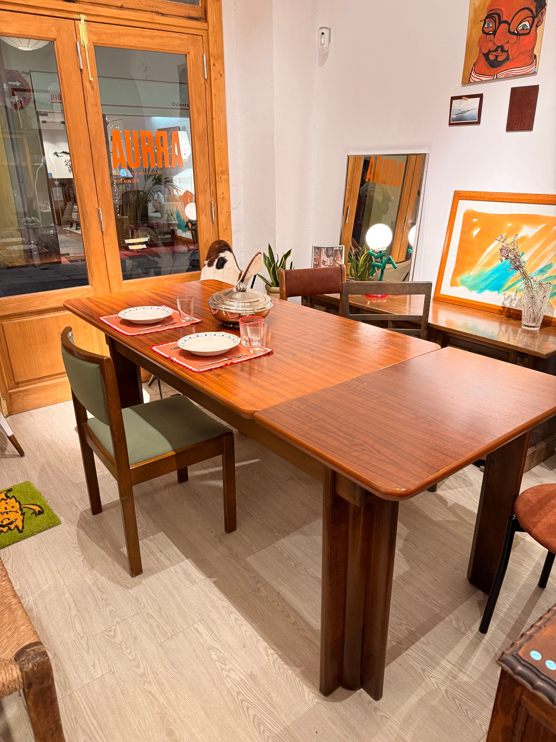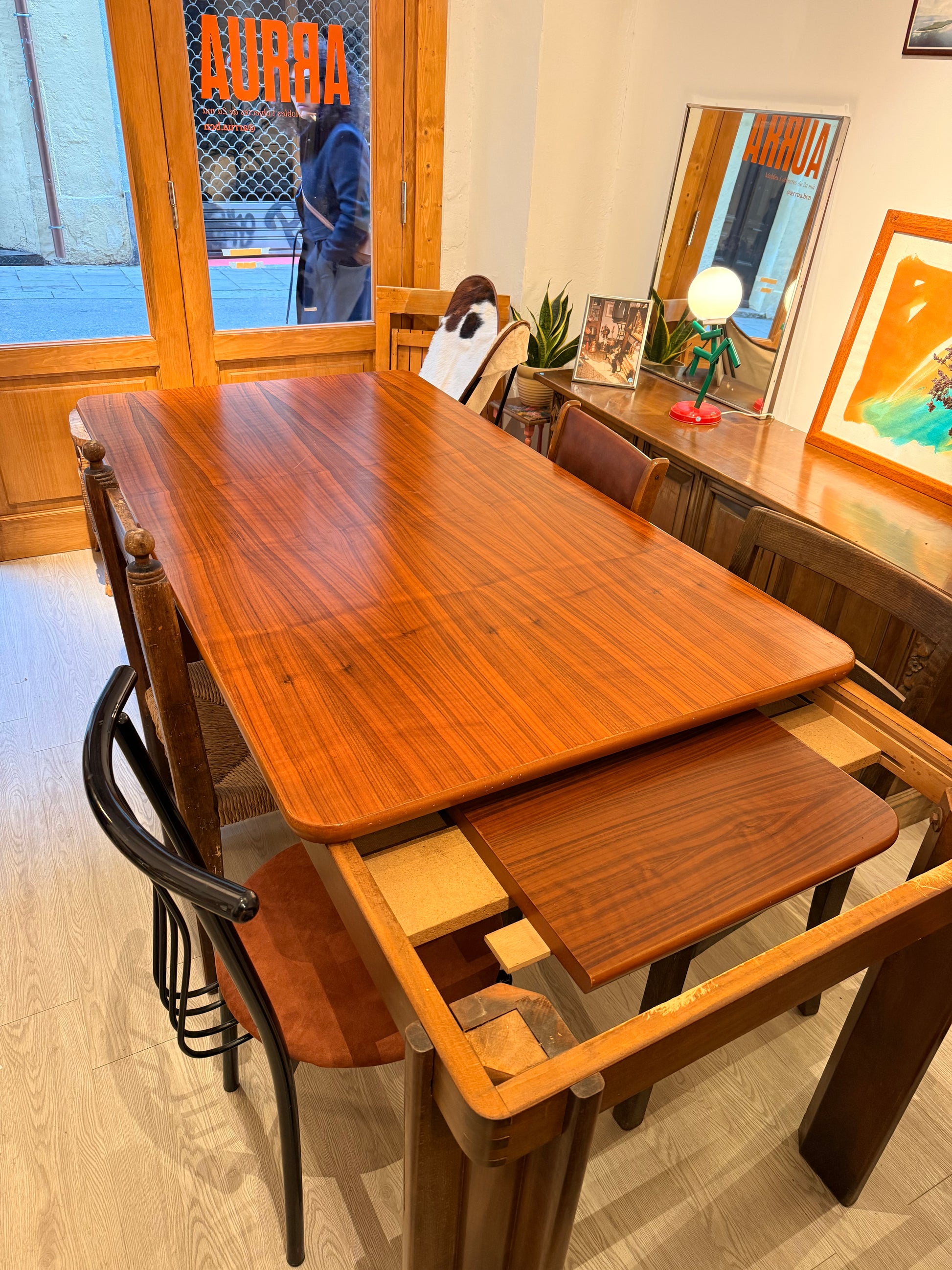 Taula de menjador de fusta per 6 persones, extensible fins a 8 persones. Potes desmontables de fusta macisa.