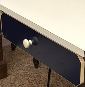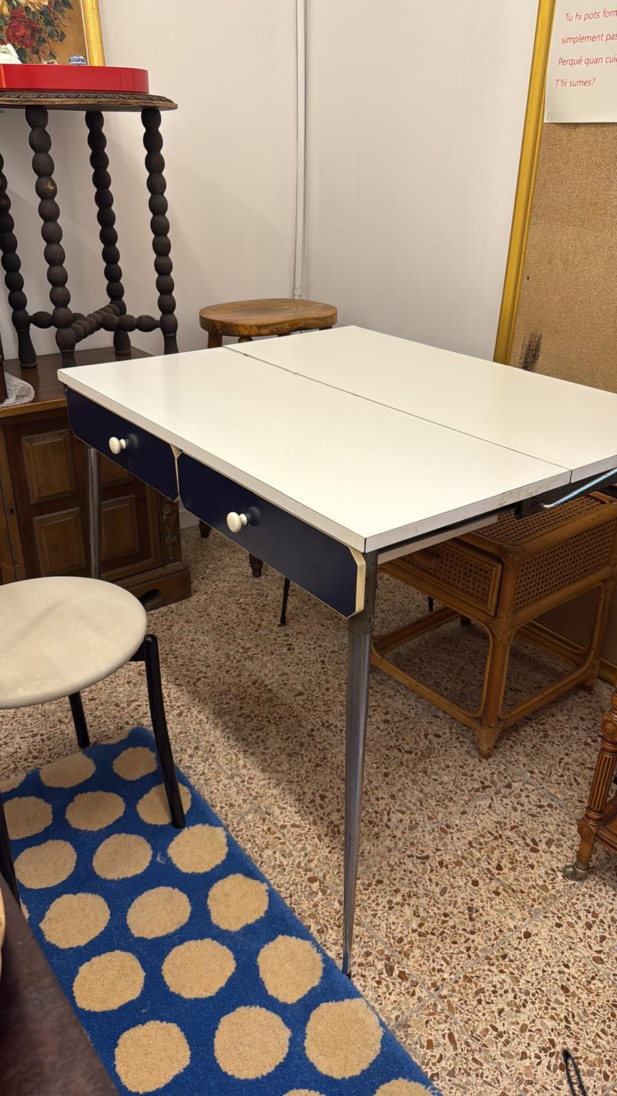 Taula extensible típica de les cuina espanyoles, blanca, amb 2 calaixos blaus i potes metal·liques.